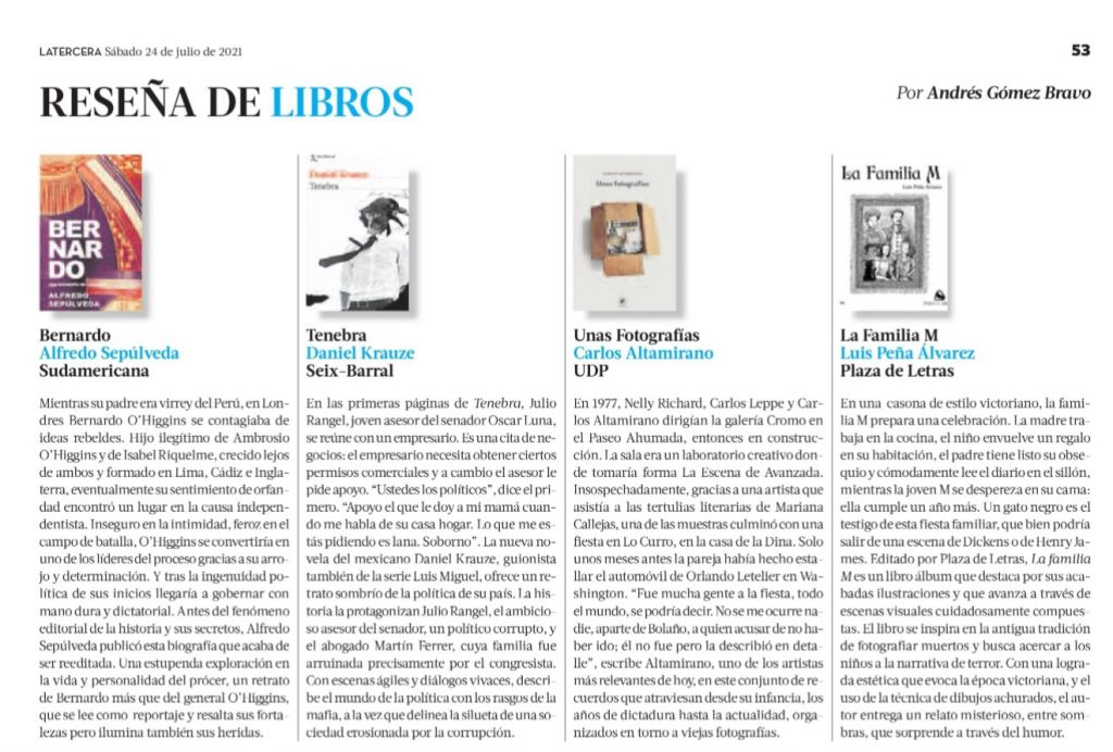 «En una casona de estilo victoriano, la familia M prepara una celebración. La madre trabaja en la cocina, el niño envuelve un regalo en su habitación, el padre tiene listo su obsequio y cómodamente lee el diario en el sillón, mientras la joven M se despereza en su cama: ella cumple un año más. Un gato negro es el testigo de esta fiesta familiar, que bien podría salir de una escena de Dickens o de Henry James. Editado por Plaza de Letras, La familia M es un libro álbum que destaca por sus acabadas ilustraciones y que avanza a través de escenas visuales cuidadosamente compuestas. El libro se inspira en la antigua tradición de fotografiar muertos y busca acercar a los niños a la narrativa de terror. Con una lograda estética que evoca la época victoriana, y el uso de la técnica de dibujos achurados, el autor entrega un relato misterioso, entre sombras, que sorprende a través del humor».
